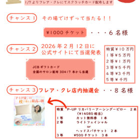 恒例『新春福引』開催です! チャンスは3回。 まずはフレア・クレにご来店いただきスクラッチカードを取得‼️ ①その場で削って→1000円オフチケット …