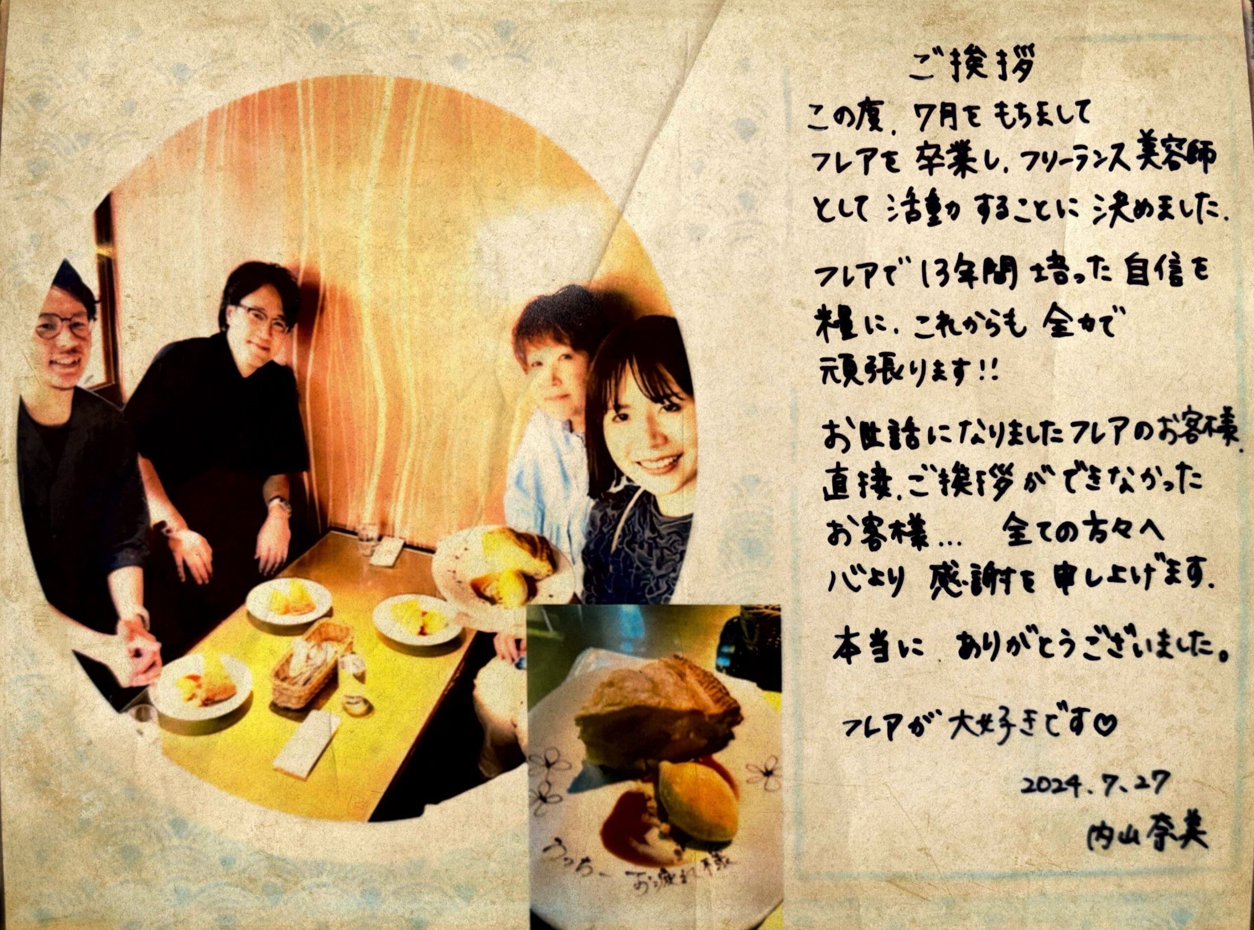 スタイリスト内山さんがフリーランスに転向のためフレアを7月いっぱいで卒業いたしました!